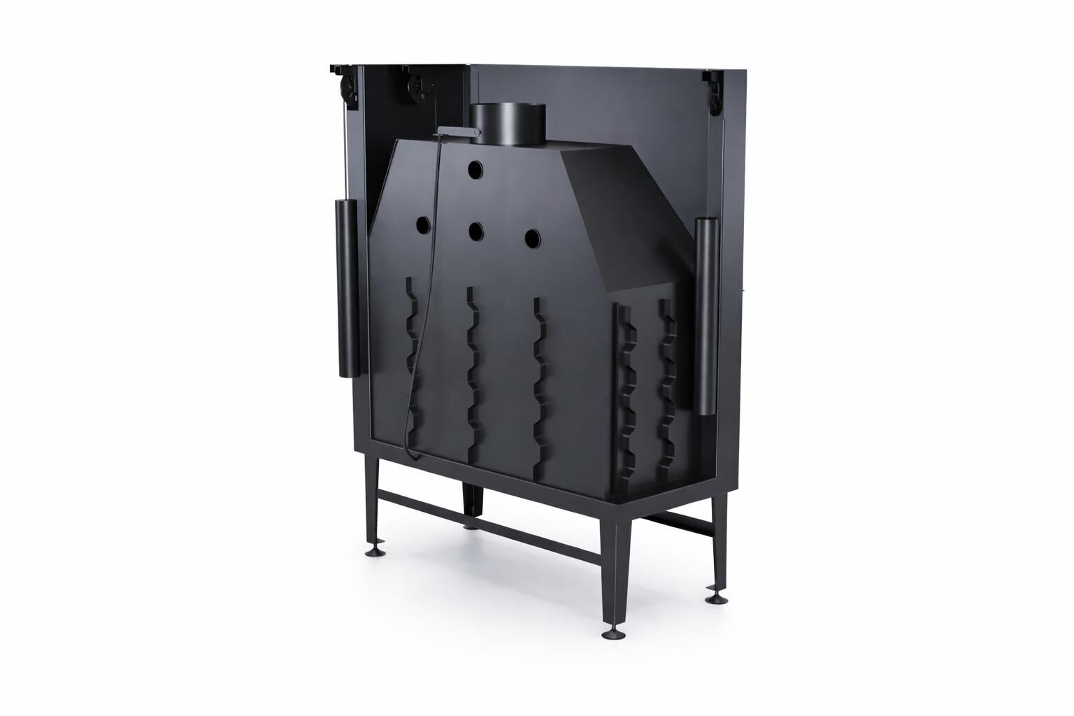 Sağ cam panelin yana açılabilir yapısı, cam yüzeyin kolayca temizlenmesini sağlarken her açıdan net bir alev izleme deneyimi sunar. Cam temizleme hava perdesi, geniş cam yüzeyin uzun süre is ve kurumdan arınmış kalmasına yardımcı olur. Bu yapı, hem kullanım konforunu hem de görsel sürekliliği destekler.