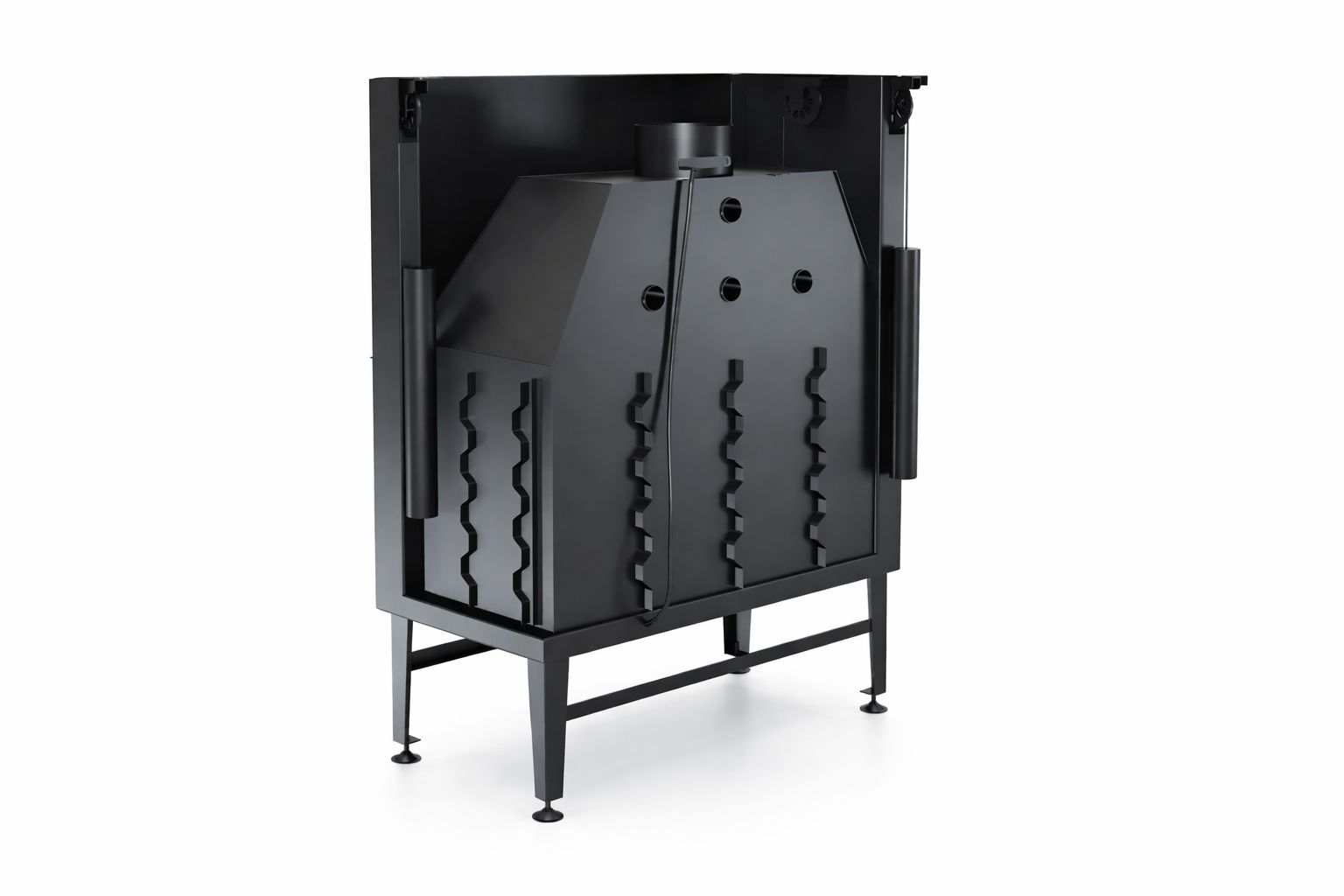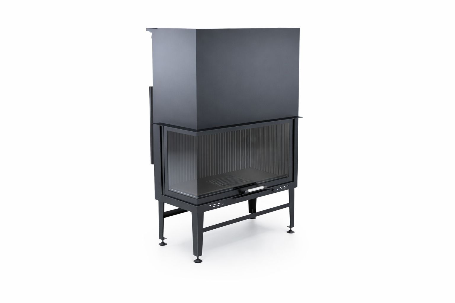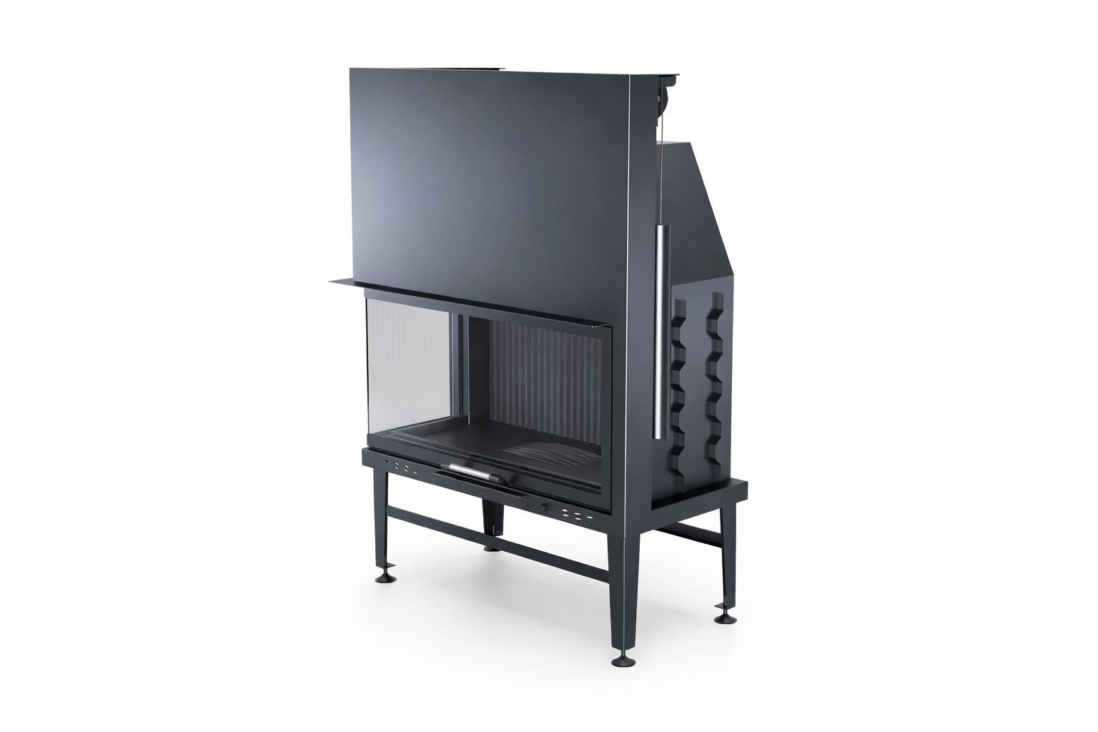 Sol camlı sahne, alevi hem önden hem yan açıdan izleme imkânı sunarak oturma düzeni nerede olursa olsun görünen alev alanını genişletir. Açık asansörlü kapak sistemi, camın yukarı kalkması sayesinde odun yükleme, kül kontrolü ve temizlik işlemlerini pratik hale getirir. Bu yapı, şömine haznesini günlük kullanımda daha konforlu, proje tarafında ise daha güvenli planlanabilir bir standart haline getirir. Entegre baca klapesi çekiş yönetimini daha okunur kılarken, opsiyonel ızgara altyapısı farklı proje senaryolarına uyum sağlar.