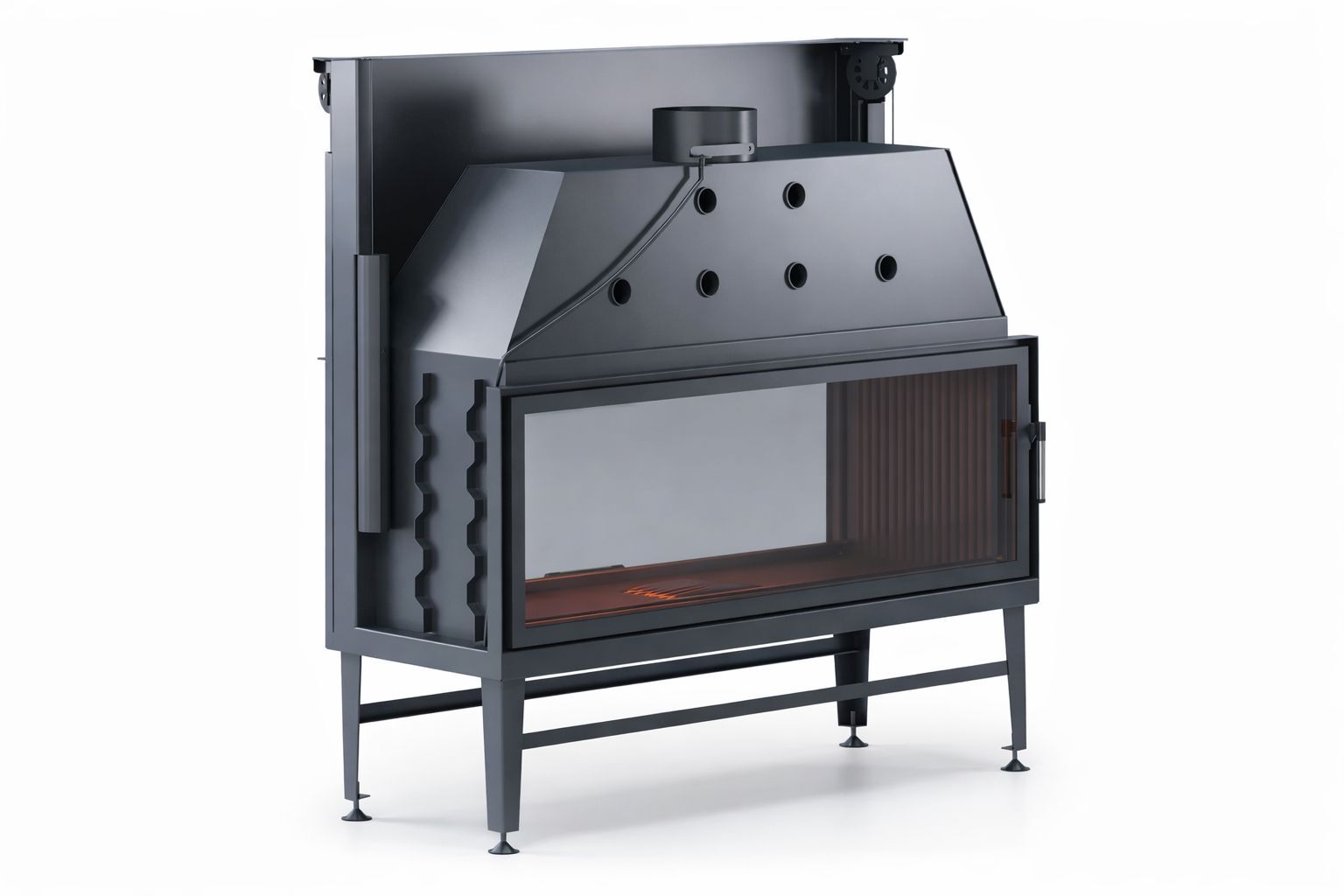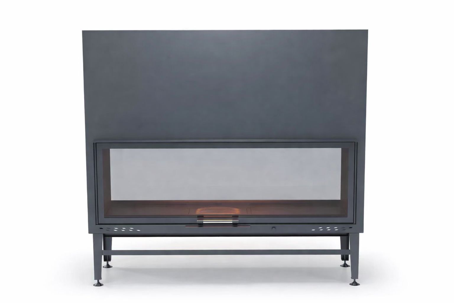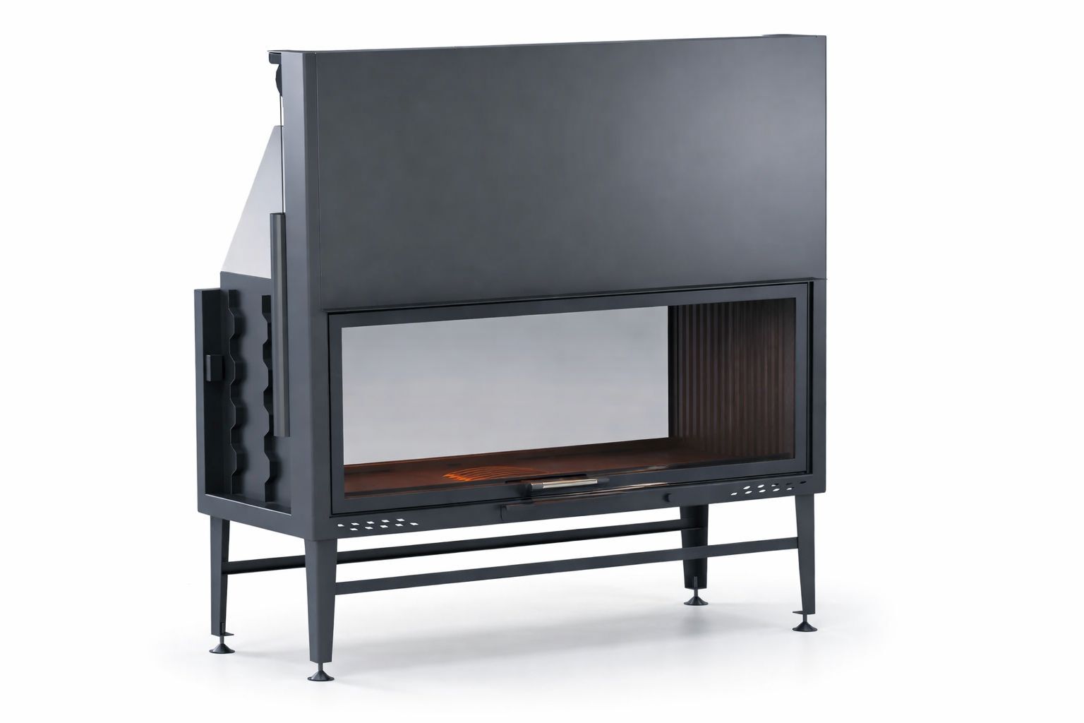 Sessiz çalışan teleskopik asansör kapak sistemi, kapağın yukarı doğru zahmetsizce hareket etmesini sağlar. Yana açılır temizlik fonksiyonu ise bakım ve kullanım kolaylığı sunar. Geniş cam yüzeyler, alevi her iki taraftan izlemeyi mümkün kılar ve ofis ya da lobi dekorasyonunu modern bir ambiyansla bütünleştirir.