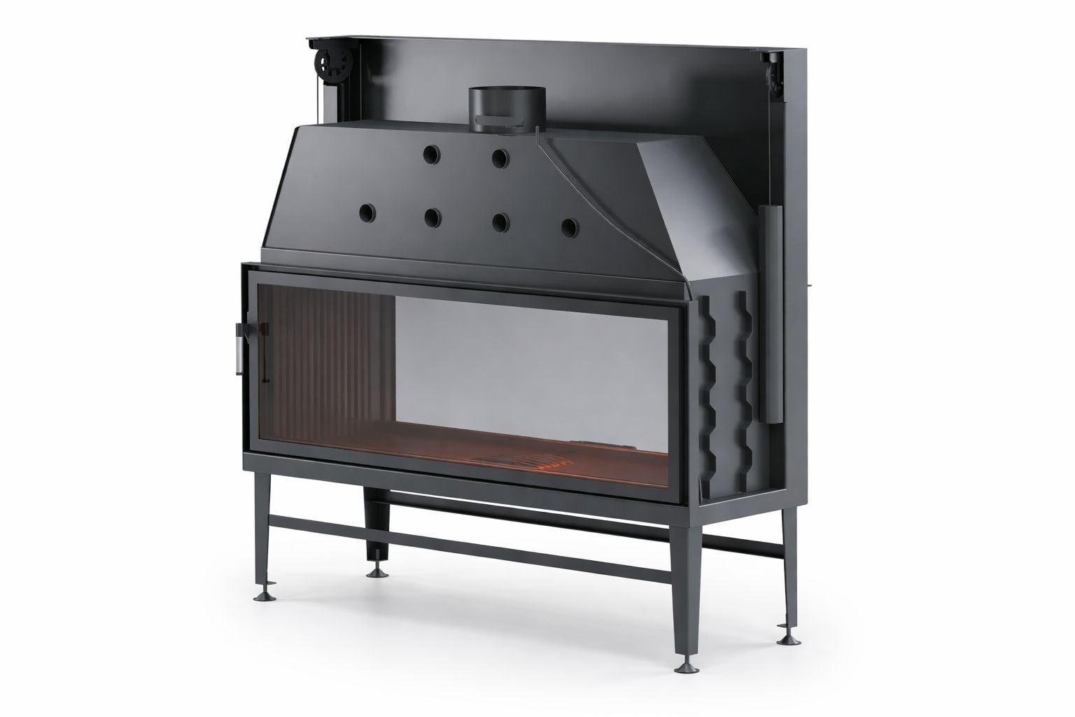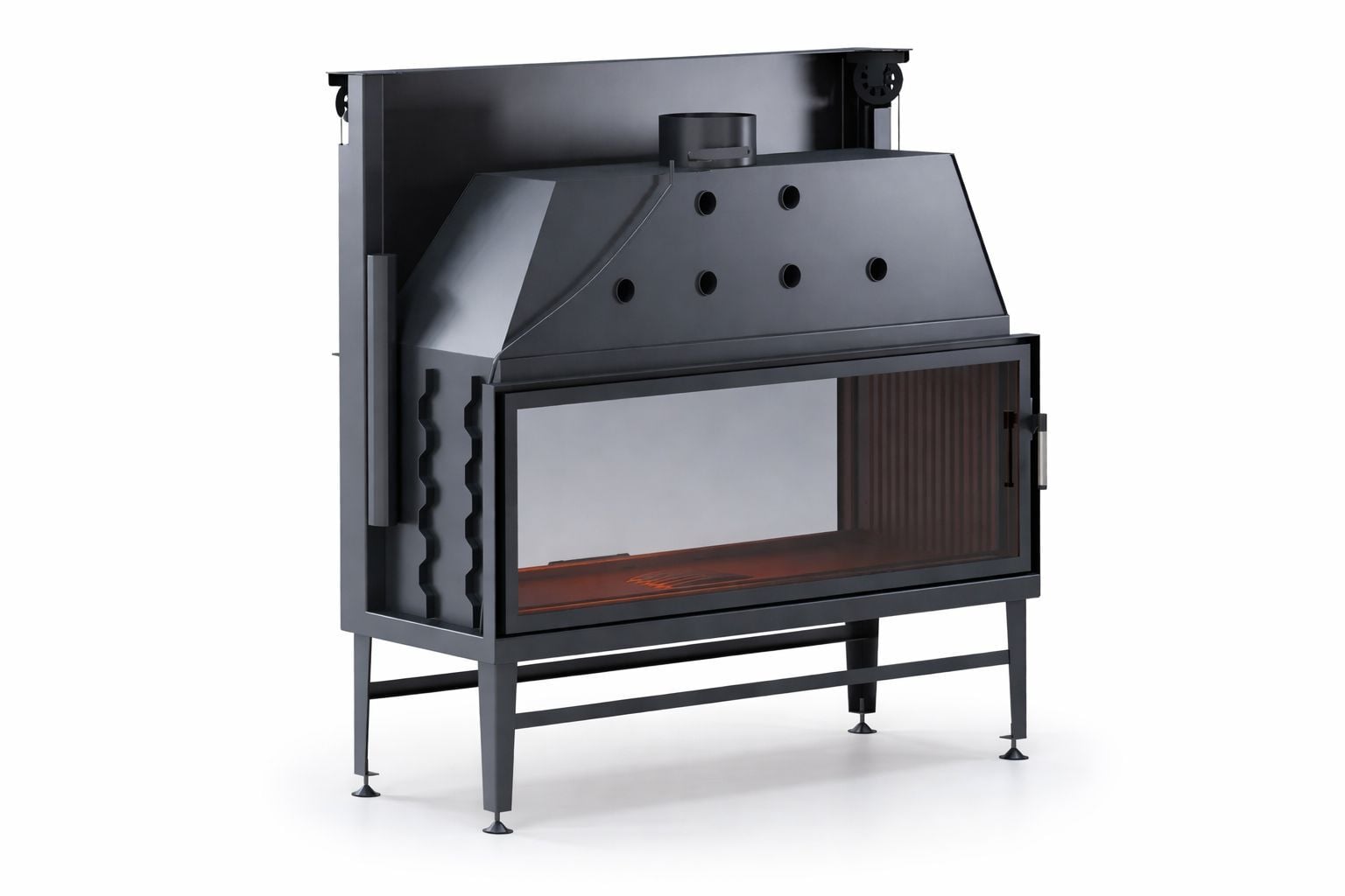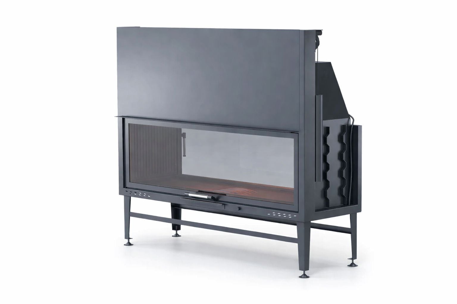 Sessiz çalışan teleskopik asansör kapak sistemi, kapağın yukarı doğru zahmetsizce hareket etmesini sağlar. Yana açılır temizlik fonksiyonu ise bakım ve kullanım kolaylığı sunar. Geniş cam yüzeyler, alevi her iki taraftan izlemeyi mümkün kılar ve ofis ya da lobi dekorasyonunu modern bir ambiyansla bütünleştirir.