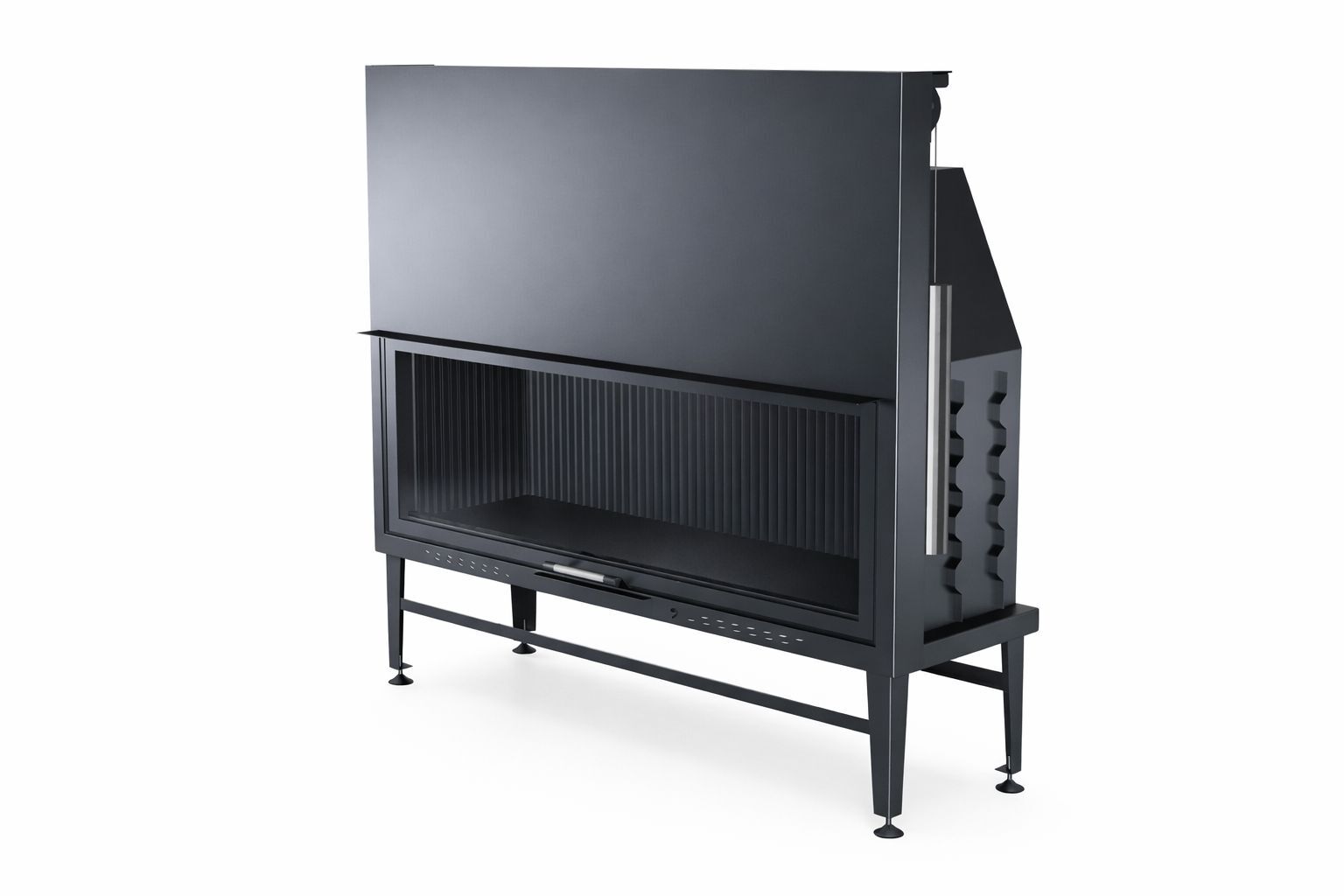 Düz tek cephe cam sahnesi, alevi “tek sahne” mantığıyla sunarak mekânda sade ama güçlü bir odak noktası oluşturur. Taş, mermer veya modern kaplama yüzeylerle birlikte kullanıldığında, duvar üzerinde mimari bir vitrin algısı yaratır. Açık asansörlü kapak sistemi sayesinde cam yukarı doğru hareket eder; bu da odun yerleşimi, iç kontrol ve cam temizliği sırasında kullanım kolaylığı sağlar.