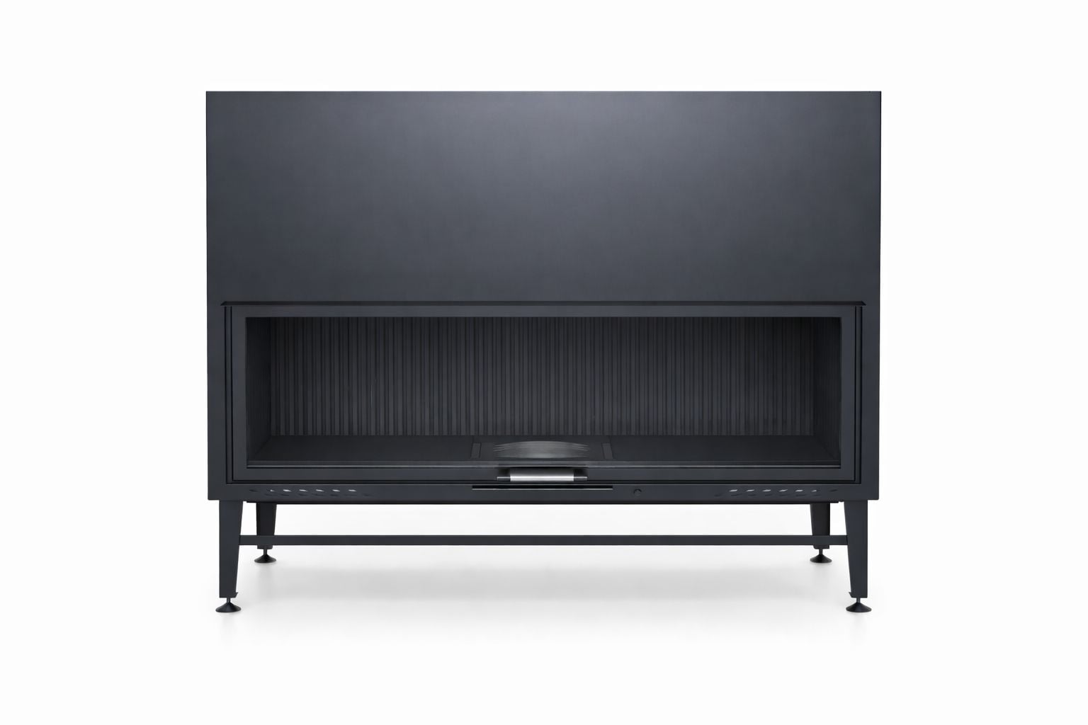 Düz tek cephe cam sahnesi, alevi “tek sahne” mantığıyla sunarak mekânda sade ama güçlü bir odak etkisi oluşturur. Taş, mermer ve modern panel kaplamalarla birlikte kullanıldığında duvar yüzeyinde mimari bir vitrin algısı yaratır. Açık asansörlü kapak sistemi, camın yukarı kalkmasıyla hazne içi erişimi kolaylaştırır; yakıt yerleşimi, kül kontrolü ve cam temizliği günlük kullanımda daha pratik hale gelir.