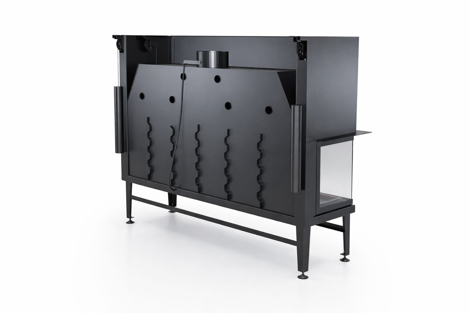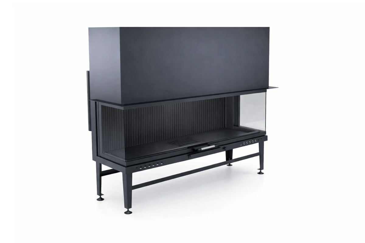 Gövdede kullanılan pik döküm hazne, 1200 °C’ye kadar yüksek sıcaklıklara dayanıklıdır ve uzun süreli kullanımda formunu korur. Güçlendirilmiş çelik paneller, ürünün genel dayanımını artırırken krom kulp detayları modern ve şık bir görünüm sunar. Bu sağlam yapı sayesinde asansörlü üç taraflı şömine haznesi, lüks konut projelerinde kalıcı bir değer oluşturur.