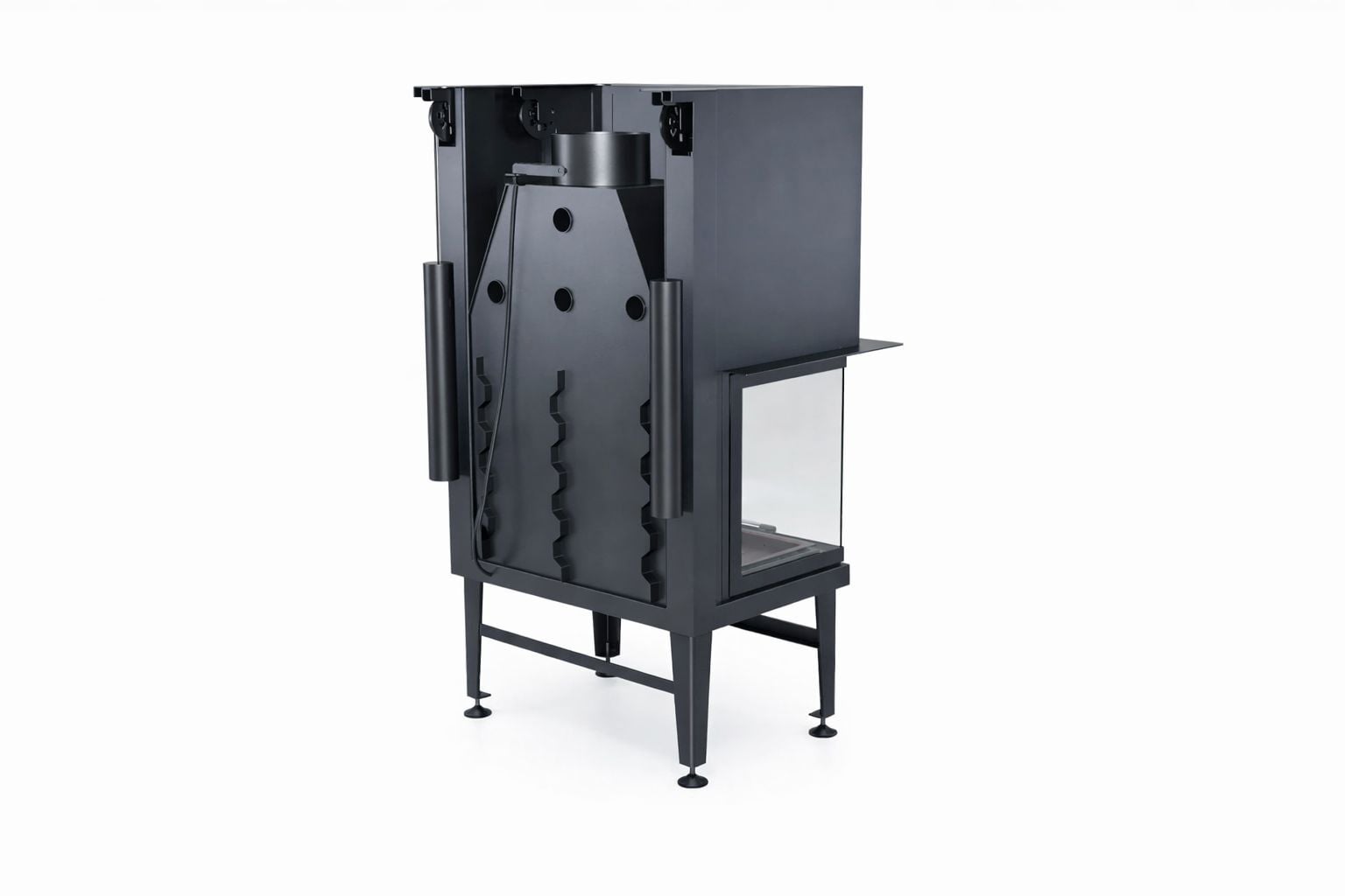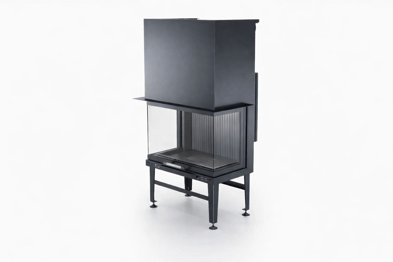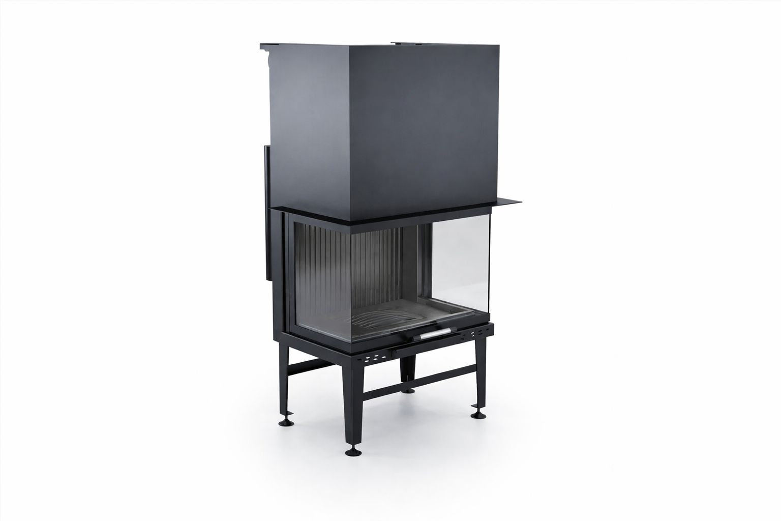 Gövdede kullanılan pik döküm hazne, 1200 °C’ye kadar yüksek sıcaklıklara dayanıklıdır ve uzun süreli kullanımda formunu korur. Güçlendirilmiş çelik paneller, ürünün genel dayanımını artırırken krom kulp detayları modern ve şık bir görünüm sunar. Bu sağlam yapı sayesinde asansörlü üç taraflı şömine haznesi, lüks konut projelerinde kalıcı bir değer oluşturur.