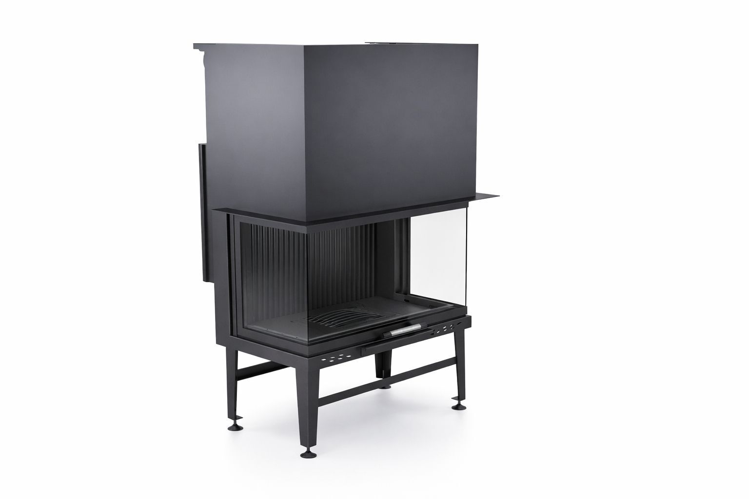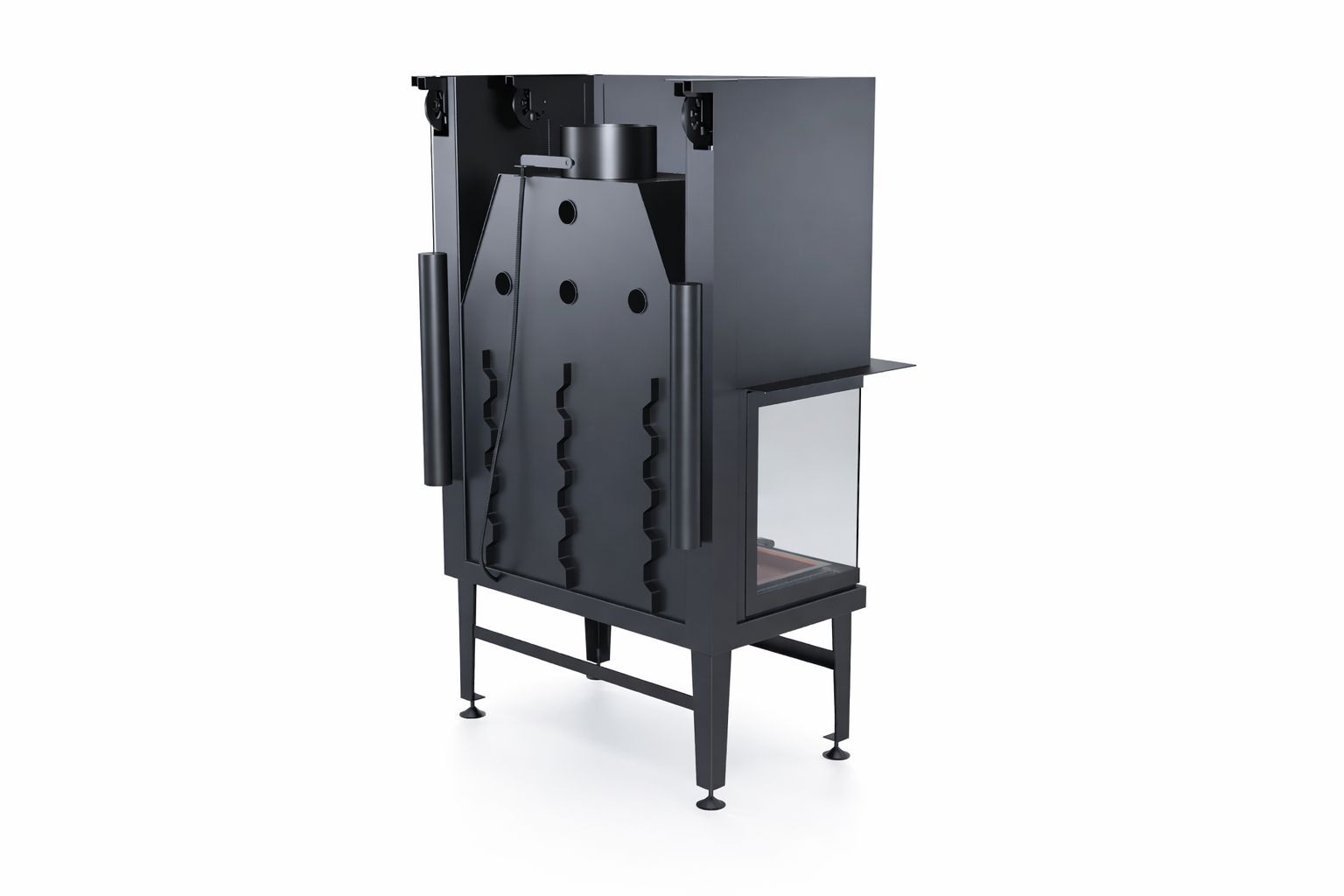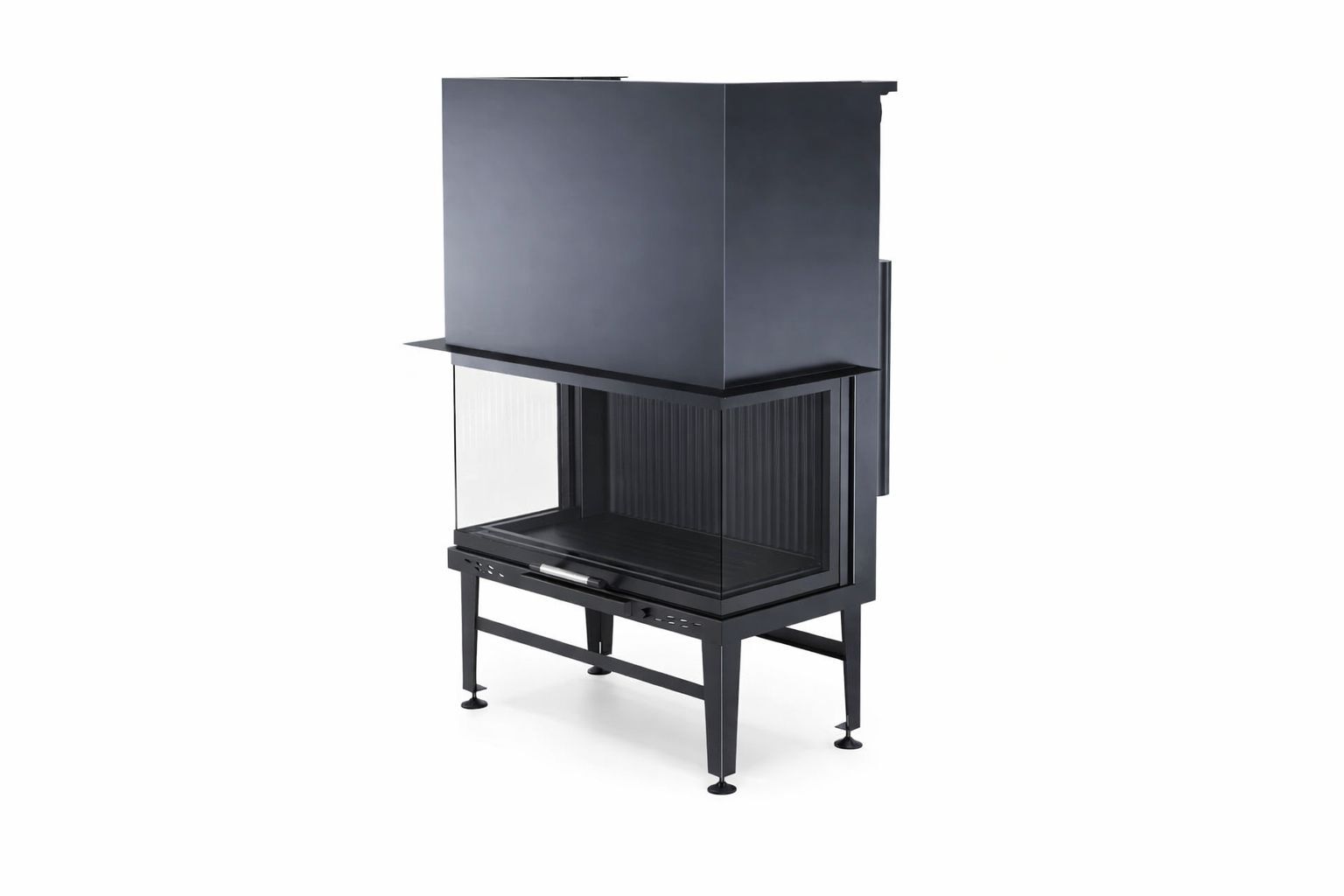Gövdede kullanılan pik döküm hazne, 1200 °C’ye kadar yüksek sıcaklıklara dayanıklıdır ve uzun süreli kullanımda formunu korur. Güçlendirilmiş çelik paneller, ürünün genel dayanımını artırırken krom kulp detayları modern ve şık bir görünüm sunar. Bu sağlam yapı sayesinde asansörlü üç taraflı şömine haznesi, lüks konut projelerinde kalıcı bir değer oluşturur.