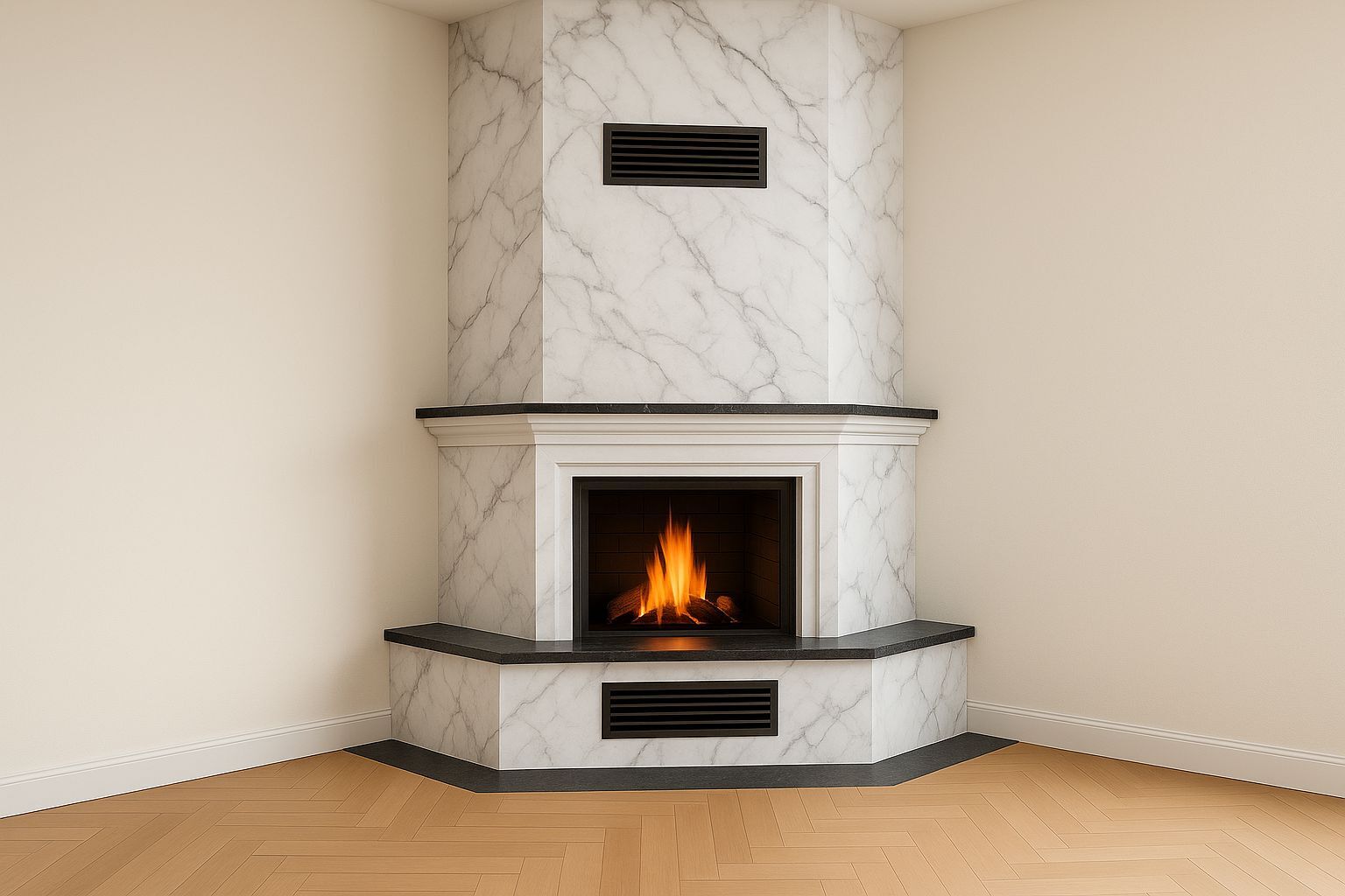 Köşe tipi döküm şömine farklı yüzeylerle bambaşka kimliklere bürünebilir: