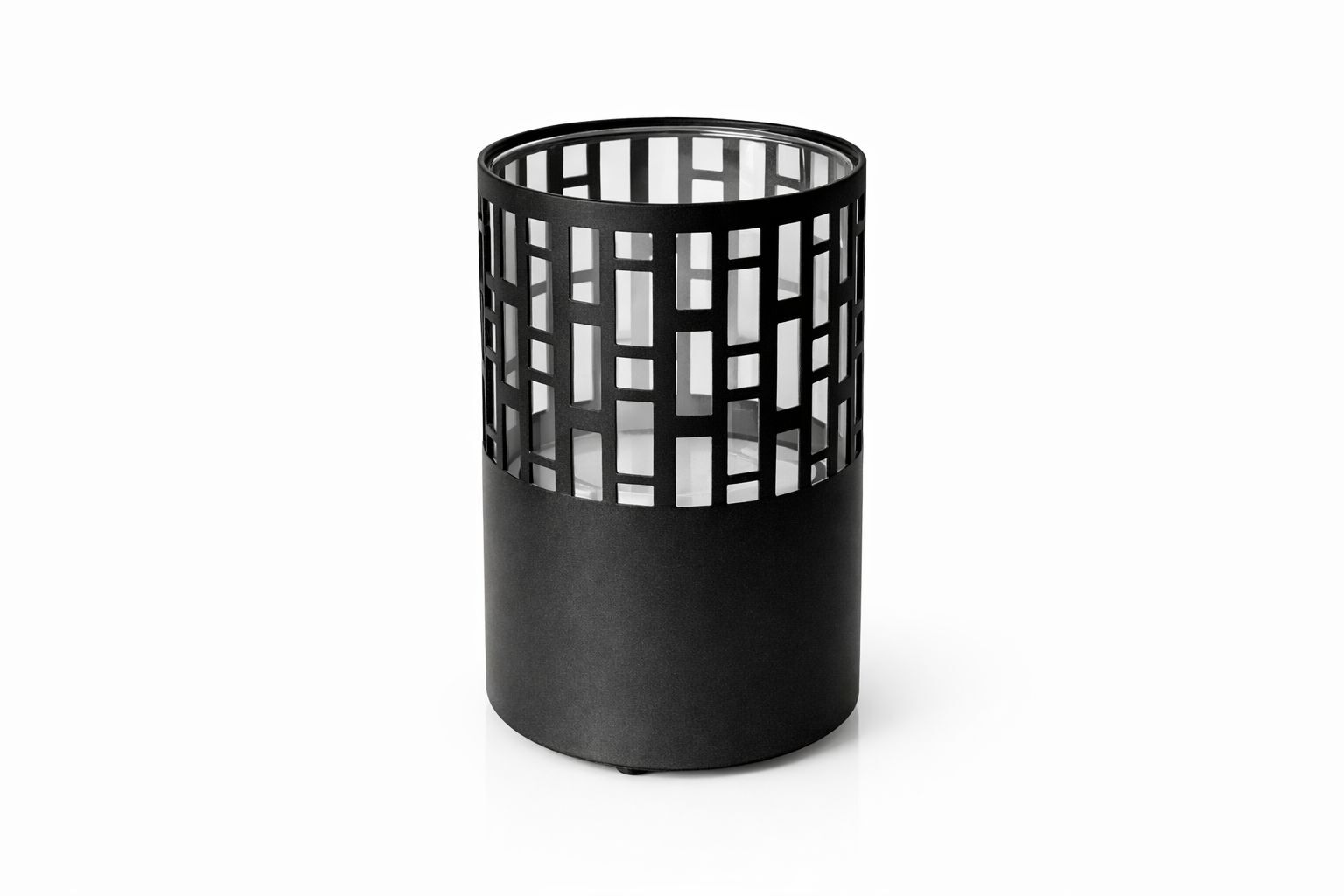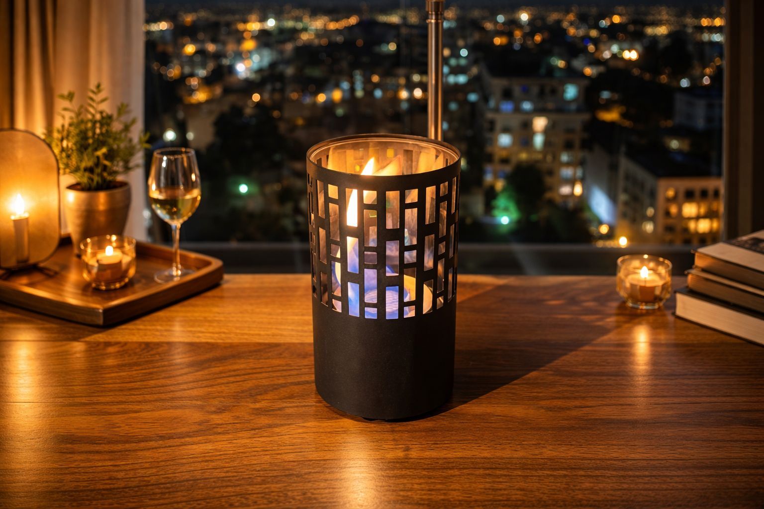 Alevora® Bianca (S) Bioethanol Şömine; silindir formda tasarlanmış, üst kısmı lazer kesim desenli metal kafes yapıya sahip kompakt masaüstü bioethanol şömine modelidir.