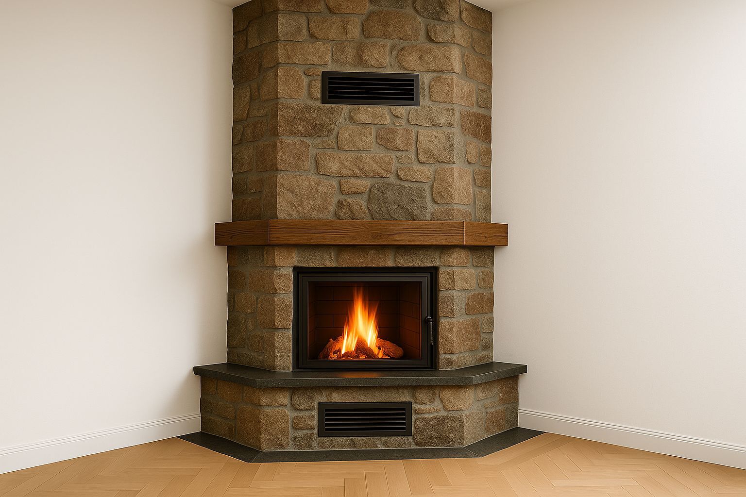 Gövdede kullanılan pik döküm, rustik dekorasyonun sağlamlık hissini tamamlar. Kapalı yanma odası, odun tüketimini azaltarak daha verimli bir ısı sağlar. Ağır gövde yapısı, yana açılır şömine sistemini yıllar boyunca güvenilir kılar. Böylece taş duvarlı, ahşap tavanlı bir mekânda bu şömine hem dekoratif hem de uzun ömürlü bir ısı kaynağı olarak görev yapar.