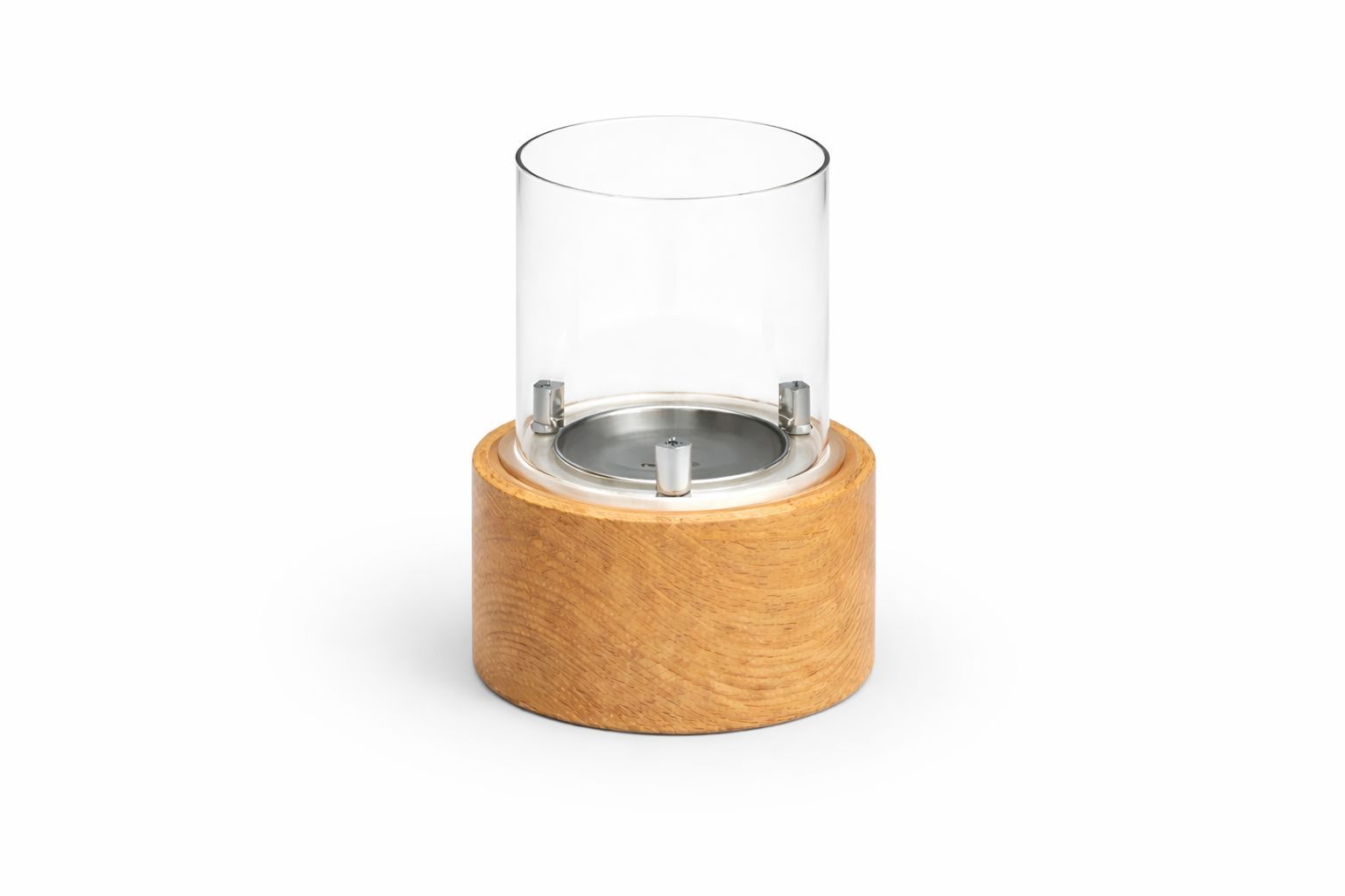 Alevora® MINIQ (Kayın) Bioethanol Şömine; doğal kayın ahşap silindir gövde üzerine konumlandırılmış paslanmaz çelik bioethanol hazne ve temperli cam koruma ile tasarlanmış masaüstü dekoratif şömine modelidir.