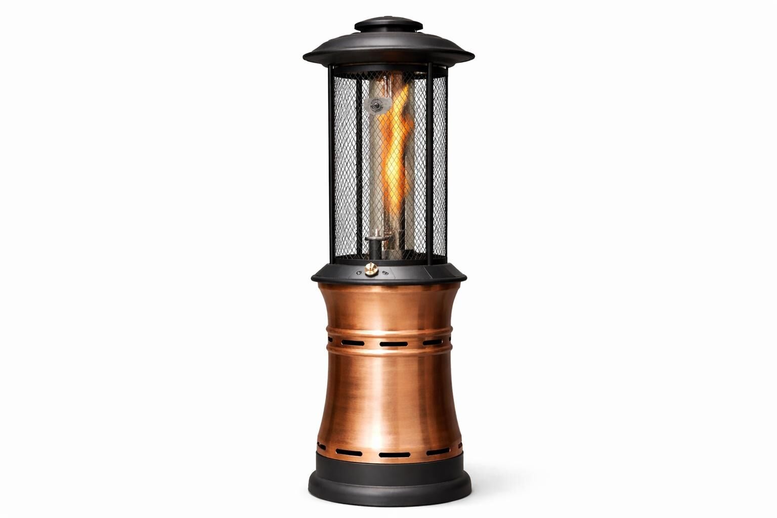 Bakır gövde yüzeyi, mekân tasarımına sıcaklık katar. Siyah üst reflektör başlık ise ısıyı aşağı yönlendirerek verimliliği artırır.