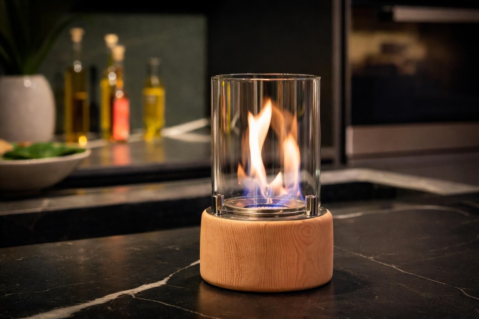 Alevora® Tophane (Kayın) Bioethanol Şömine; doğal kayın ahşap silindir gövde üzerine konumlandırılmış paslanmaz çelik brülör ve silindirik cam koruma ile tasarlanmış masaüstü bioethanol şömine modelidir.