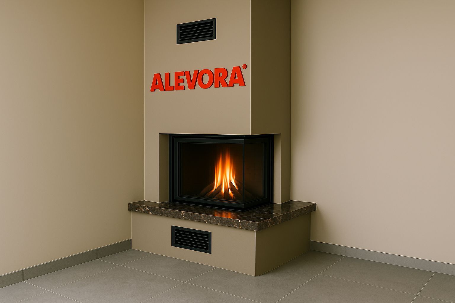 Alevora Şömine L tipi asansörlü odunlu şömine, köşe mimariye uygun çift cepheli cam yapısı ve yukarı doğru açılan asansörlü kapak sistemiyle geniş ve derin bir alev izleme alanı sunar. Yüksek dayanımlı döküm hazne yapısı, dengeli yanma karakteri ve yüksek ısı verimliliği sayesinde konforlu bir kullanım sağlar. Kontrollü hava sirkülasyonu sağlayan menfez sistemi, sıcaklığın mekân içerisine homojen biçimde yayılmasına katkıda bulunur. Mermer, doğal taş veya sade yüzey kaplama seçenekleriyle modern ve lüks iç mekân projeleriyle estetik uyum sağlar.